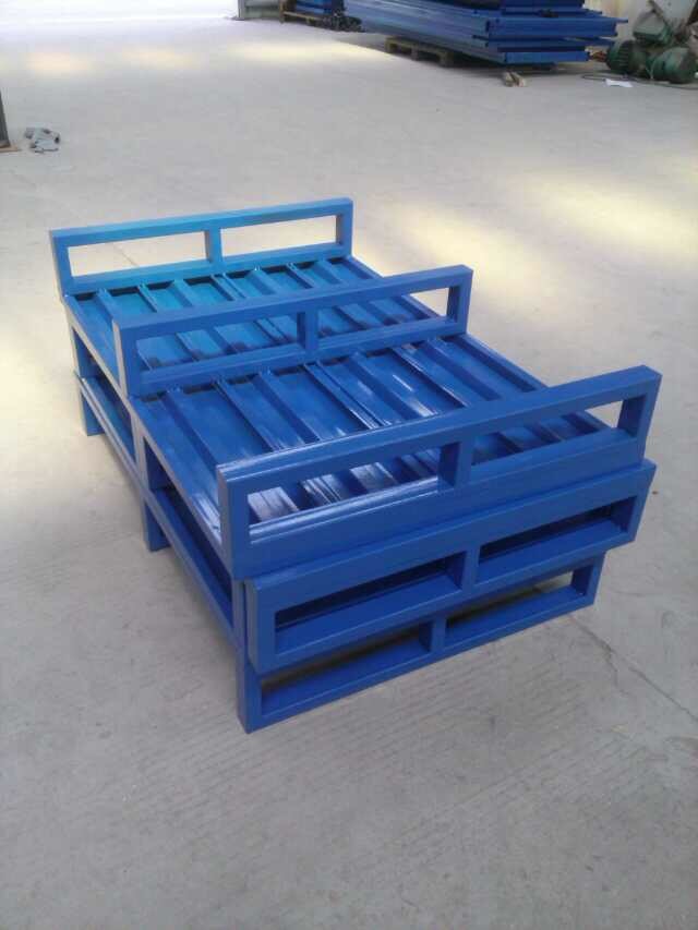 鋼制托盤是一種用于機械化裝卸、搬運和堆存貨物的集裝箱單元工具,基本結構由單層鋪板下設縱梁或墊塊、支腿等所組成,托盤的最小高度以能方便使用叉車或托盤搬運車為原則。