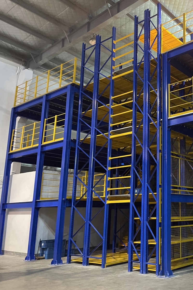 原理其實是一致的,就是分別搭建出上述所說的閣樓貨架以及鋼平臺結構,再將兩者結合在提前設定的指定區域處進行無縫拼接,通過鍍鋅樓板和樓板扣的鎖緊,兩個過道平臺可以完美通過,做到整體結構平穩,四周安裝警示護欄。