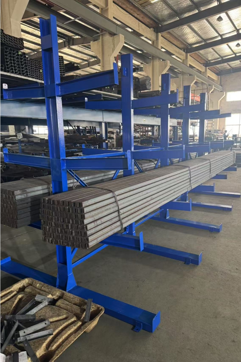 那么該貨架是應用在什么場合呢?通常是針對一些原材料廠家客戶,將長條形的材料或者原材放置在懸臂貨架上,便于做到6S的管理。第一,進廠的時候方便歸類清楚,不同的型材以及總量都能很好的分類清楚;第二,多批量的、型材統一的可以放置在同一層或者同一區域;第三,方便出貨,利用行車或者叉車,將貨物挑出。