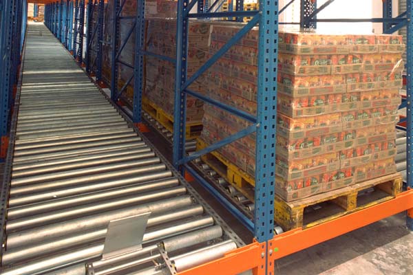 每一個貨格就是一個具有一定坡度的存貨滑道。人庫起重機(jī)裝入滑道的貨物單元能夠在自重作用下,自動地從入庫端向出庫端移動,直至滑道的出庫端或者碰上已有的貨物單元停住為止。位于滑道出庫端的第一個貨物單元被出庫起重機(jī)取走之后,在它后面的各個貨物單元便在重力作用下依次向出庫端移動一個貨位。為減少貨箱與貨架之間的摩擦力,在存貨滑道上設(shè)有輥?zhàn)踊驖L輪。