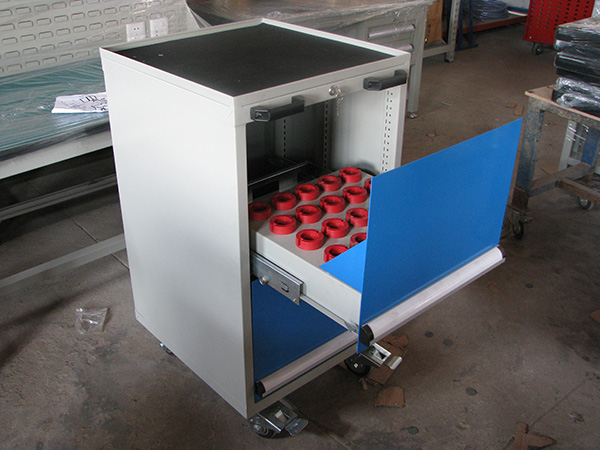 刀具架適用于加工車間、維修車間等場合,可分類放置刀具,并可靈活移動方便取用,F代貨架廠生產的HY-HSK系列刀具車成多邊成型的前后側板上有模數化的人字孔,可將刀具座掛板按水平或15、30傾斜放置,方便多種刀具的存放。高強度腳輪,車前為兩個定向輪,車后為兩個萬向帶 剎車輪,推行平穩,方向性好,剎車固定后不會滑動。結構特點 1.配有標簽,明確分類. 2.快速拿出工具,節約查找時間. 3. 配有輪子,便于移動. 4.抽屜可拉出100%。